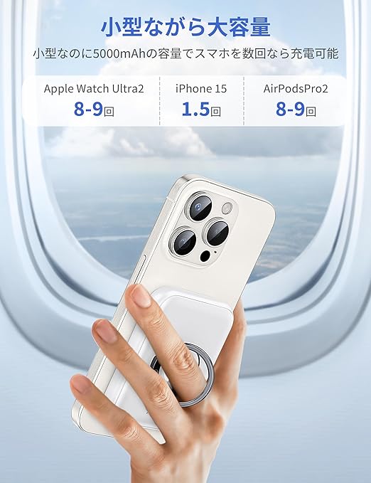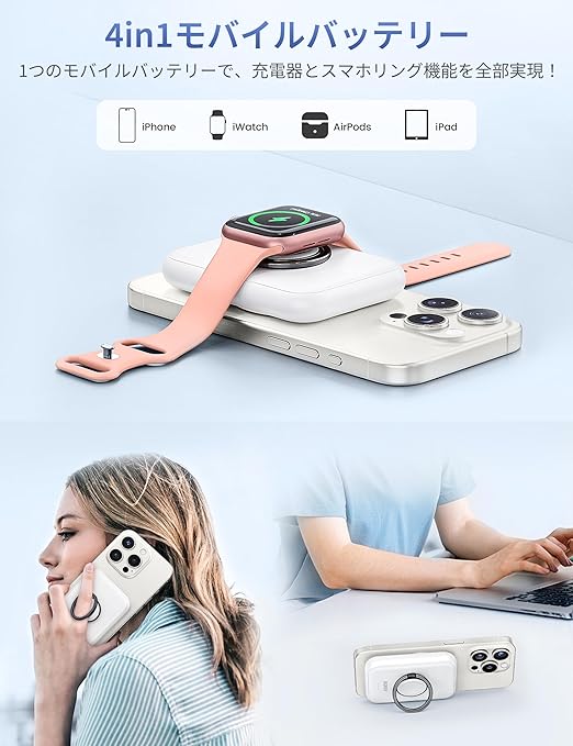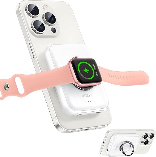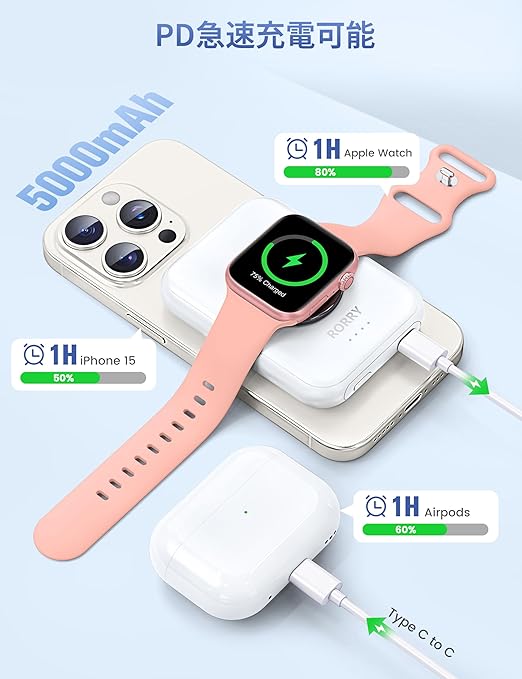 RORRY モバイルバッテリー magsafe対応 apple watch モバイルバッテリー【超小型・マカロン色・リング&スタンド付】5000mAh 3in1ワイヤレス充電器 軽量 小型 iPhone&iWatch同時充電 可愛い マグセーフ充電器 パススルー 持ち運び便利 iPhone16/15/14/13/12/iWatch Ultral2/S10/9/8などに対応 津波/台風/防災グッズ a