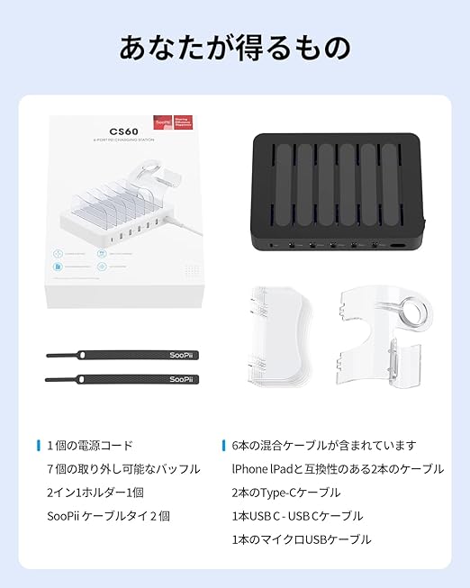 首佩 60W 6ポートUSB急速充電ステーション、PSE認証済 充電スタンド 6本の充電ケーブルが含まれ、 iPhone iPad iWatch iPodと互換性があり、I-Watch充電器ホルダー、電話、タブレット、その他の電子機器用 a