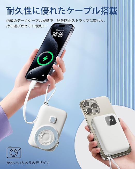 【マグネット式・くっついたまま充電可能】MagSafe技術を応用した磁気吸着式ワイヤレスモバイルバッテリーは、強力な磁力を内蔵しており、スマートフォンを「パチッ」と貼り付けるだけで充電が開始されます。10000mAhの大容量を持ち、日常使用や出張のニーズを満たし、充電器やデータケーブルを持ち歩く煩わしさを解消します。このMagSafeモバイルバッテリーはコンパクトで持ち運びに便利、重量はわずか203グラムで、片手で持っても非常に軽快です。日常使用に適しているだけでなく、アウトドア活動やキャンプ、