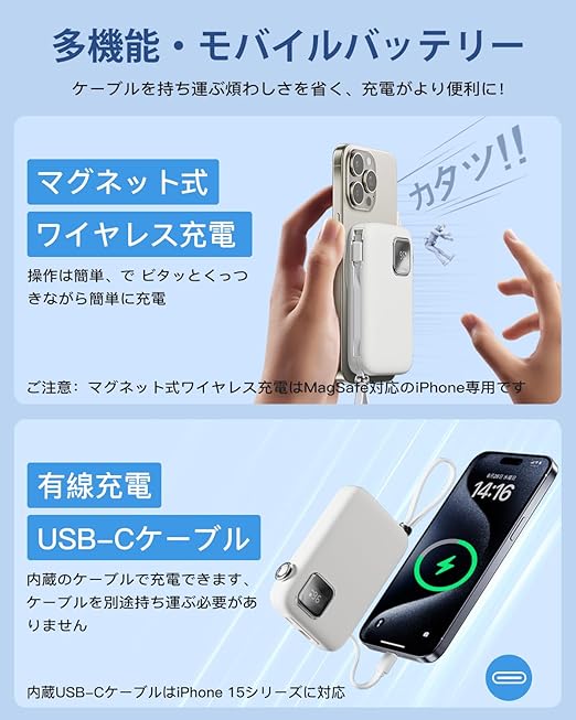 モバイルバッテリー 【MagSafe対応・2024新モデル】 モバイルバッテリー 10000mAh 大容量 ワイヤレスモバイルバッテリー マグネット式 マグセーフ充電器 a