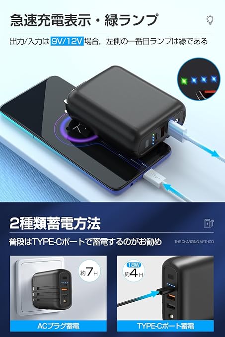 【2in1大容量モバイルバッテリー&急速充電器】従来のモバイルバッテリーや充電器は単機能でしたが、本製品はACアダプターを搭載し、モバイルバッテリーと急速充電器の2役をこなすのが最大の特長です。コンセントに差し込めば急速充電器として使用でき、抜けばすぐに15000mAhのモバイルバッテリーとして利用可能。飛行機内への持ち込みも対応しており、出張・旅行・アウトドア・キャンプ・停電対策・防災グッズとして最適です。