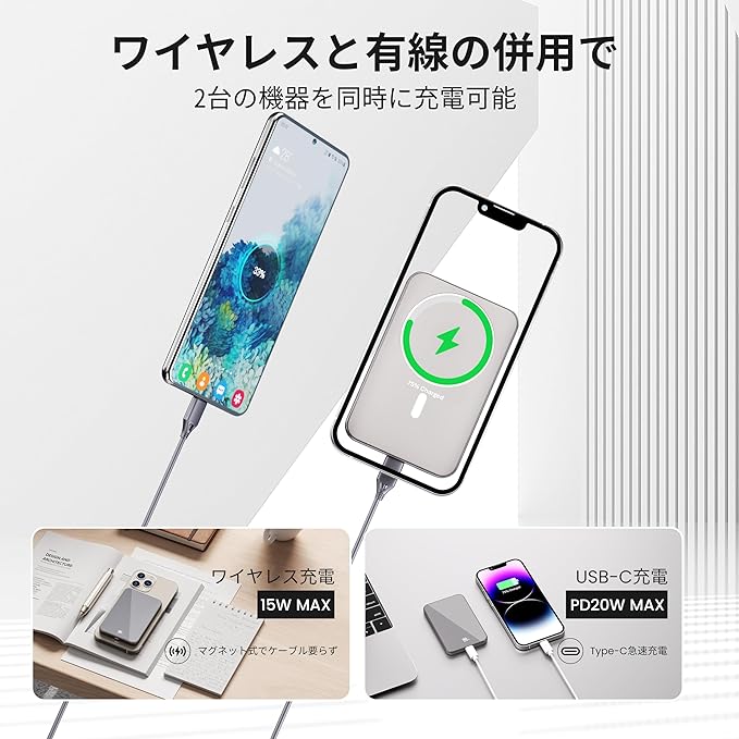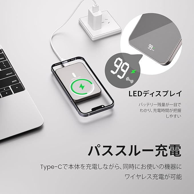 Yamisan【MagSafe対応・ワイヤレス充電器】モバイルバッテリー 超軽量 小型 マグセーフ充電器 スマホ充電器 5000mAh マグネット式 急速充電 Type-C入出力兼用 携帯充電器 薄型 LED残量表示 iPhone16/15/14/13/12シリーズ対応 コンパクト 旅行/出張/停電対策 持ち運び便利(PSE認証済み) a