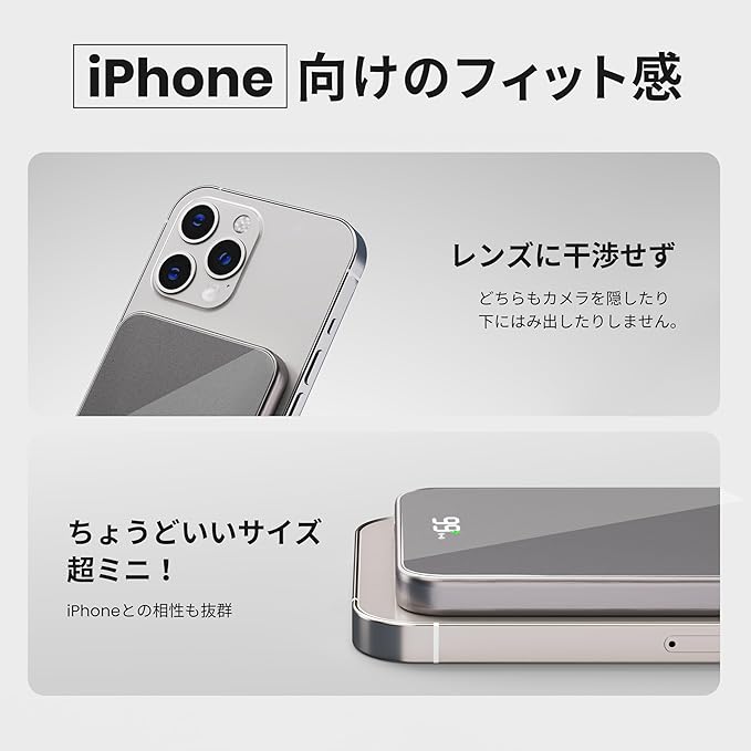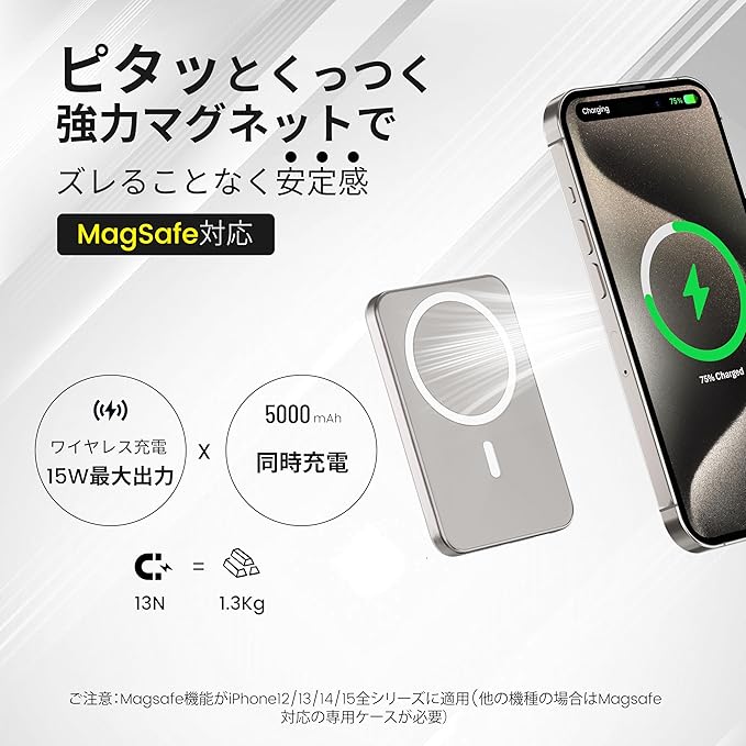 【くっつけるだけで充電】MagSafeを搭載することで、強力な磁石でiPhone本体にピタッとくっつき、「簡単」かつ「安全」に接続できます。MagSafe対応のiPhone16/15/14/13/12シリーズを近づくだけで背面に引き込まれ、充電ケーブルを差し込む手間が省けて、めっちゃラクチンです。夜、暗闇でスマホを充電しようとして、ケーブルの向きを間違えた…なんて経験、MagSafeならもうありません!