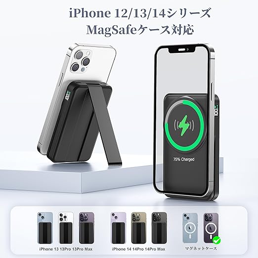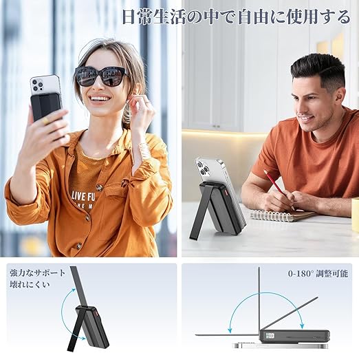 【マグネットでピタッ】マグネット吸着なので対応機種を近づけるだけでピタッと吸着で、オンライン会議、動画などを見ながらもさくさく充電。優れたマグネット吸着性を備え、強力な磁力でiPhoneを吸着し、落ちるご心配が必要なく、しっかりと吸着します。ワイヤレス充電ができる多機能モバイルバッテリーです。