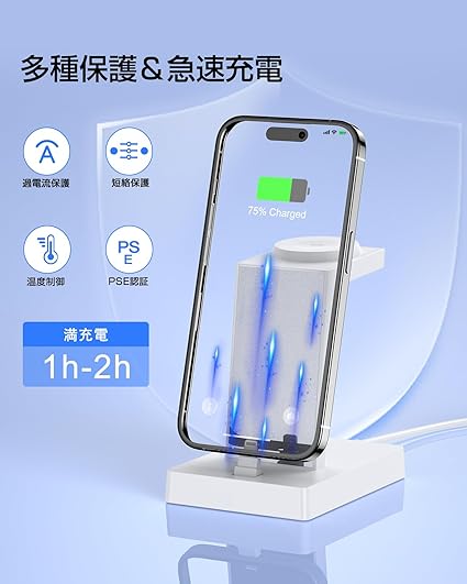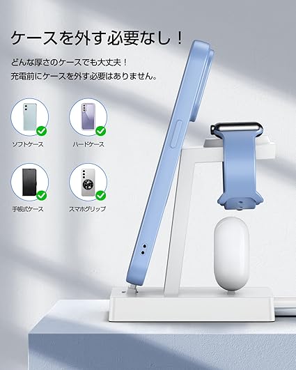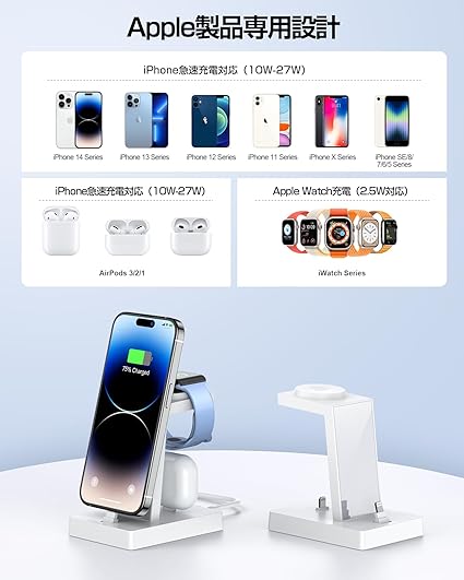 【27W急速充電スタンド】 iPhone・AirPods・Apple Watchの3デバイスを同時に充電可能!アイフォン純正ケーブルと同等の高速充電を実現し、i-Phoneは最大27W、Apple Watchは2.5W、AirPodsは5Wで効率的に充電できます。複数の充電器を使う手間を省き、シンプルで快適な充電体験を提供します。