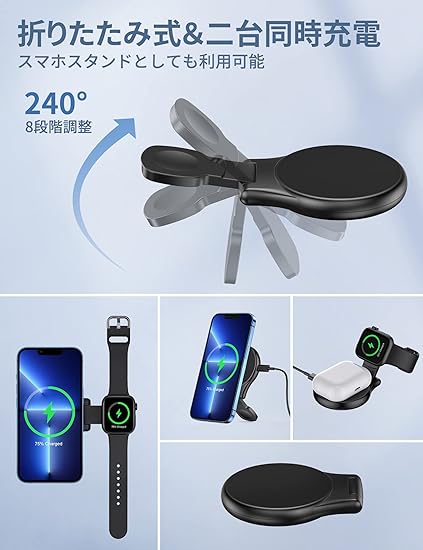 KINIVA ワイヤレス充電器 Apple Watch 充電器 MagSafe対応 3in1 折りたたみ式 15W 急速 iphone 充電器 アップルウォッチ 充電スタンド 置くだけ充電 2台同時充電 For Apple Watch Ultra/9/8/7/AirPods iPhone 15/14 /13 /12用 コンパクト 持ち運び Type-Cケーブル/magsafe リング付き ブランク a