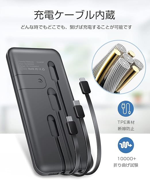 軽量 薄型 新版 モバイルバッテリー 10000mAh 大容量 3ケーブル内蔵(Lightning+Micro USB+Type-Cケーブル内蔵) 1USBポート 4台同時充電でき 急速充電 バッテリー スマホ充電器 携帯 持ち運び便利 残量表示 スタンド機能搭載 PSE認証済 iPhone/iPad/Android対応 a