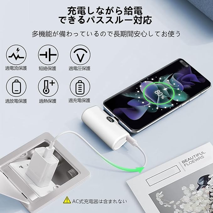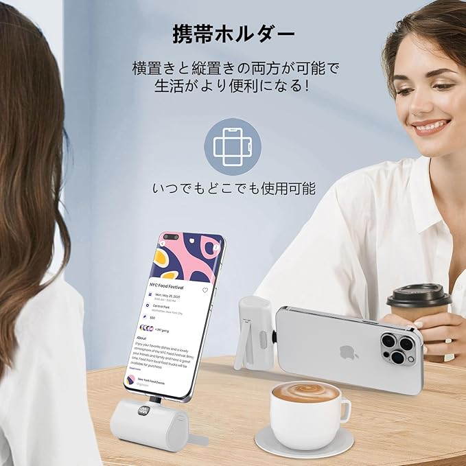 LUCKYDUO モバイルバッテリー 軽量 小型 5000mAh Type-Cコネクター内蔵 コードレス コンパクト 直接充電 急速充電 LCD残量表示 LEDライト&スマホホルダー付き Android用iPhone16/15/Xperia/Galaxy/Pixel/HUAWEI/ゲーム機など充電対応 PSE認証済(ホワイト) a