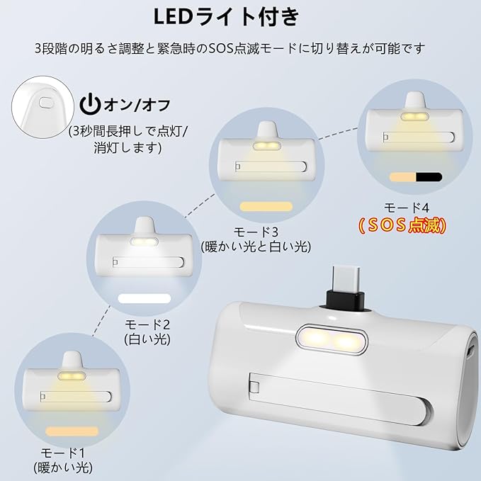 【直接充電&懐中電灯付き】このモバイルバッテリーはAndroidユーザー向けに設計で、差し込むだけで充電でき、USB-Cコネクタ内蔵型のモバイルバッテリーです。「ケーブルを忘れて充電できない…」ということも防ぐことができます。LEDライトは3段階の明るさ調整と緊急時のSOS点滅モードに切り替えが可能です。照明にも自撮りにも使える補光灯としても使えます。暗闇でライトとしても活用できます。遭難など、緊急時には点滅モードにも切り替えれば、声が出ない場合でも居場所を伝えることができます。