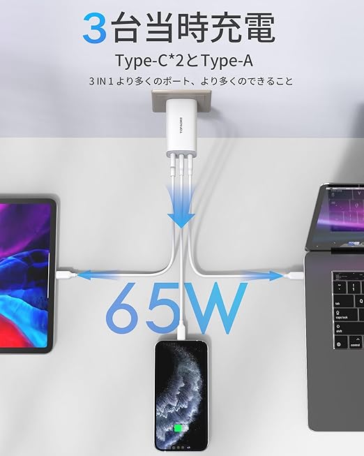 【3 IN 1 65W 急速充電器 】TOPADRE タイプC 充電器はType-Cポートを2つ、USB-Aポートを1つ搭載して、3台のデバイスを同時充電に対応。65Wの出力パワーはMacbookシリーズからスマホまでの全てのUSB-Cデバイスに充電可能で旅行でも自家用でもこの一つで十分(単ポートも65W対応)コンパクト化を実現、持ち運びに便利、旅行や出張にビッタリです!ご注意:ノートパソコンの充電にはCポートのみを使用できます。PC端で高電力充電する場合、Type-Cポートをシングルポートモー