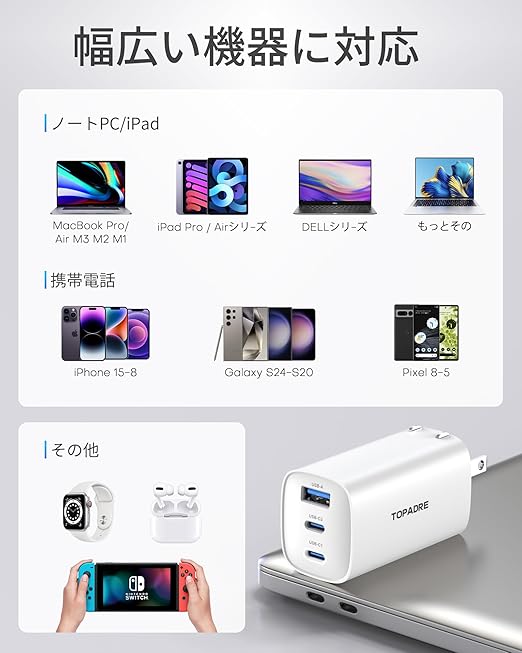 TOPADRE 急速充電器 65w PD 充電器 Type-C USB 3ポート三台同時充 電 [超低温/GaNIII技術/折りたたみ式プラグ] タイプc 充 電器 対応MacBook/iPad/Android/Windows PC PSE認証済 PD3.0 対応iphone 16/15/14/13 フルシリーズ対応 白 a