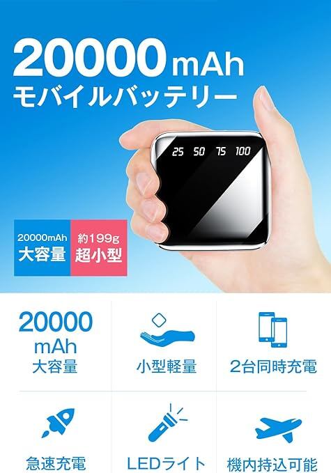 【大容量モバイルバッテリー】コンセントのない場所や外出先でも、これ一台あればスマホやタブレットを安心して手軽にスマホを充電できます。20
