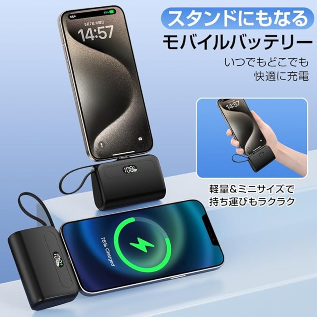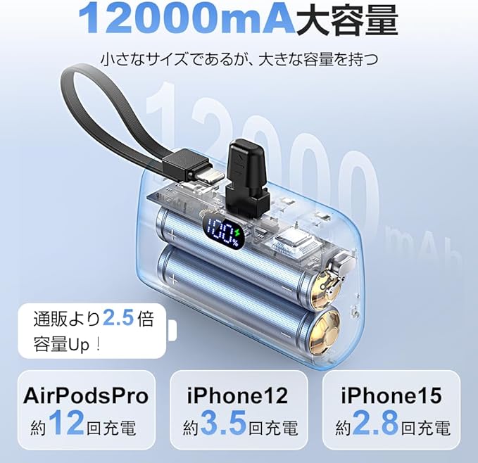 モバイルバッテリー 大容量 【2025軽量設計・12000mAh・直挿し型】 タイプc モバイルバッテリー ケーブル付き アンドロイド 軽量 小型 iphone 機内持ち込み可 type-c 携帯充電器 2.1A 急速充電 直差し LCD液晶残量表示 ケーブル内蔵 ストラップ付き 持ち運び便利 コンパクト ライトニング スタンド付き a