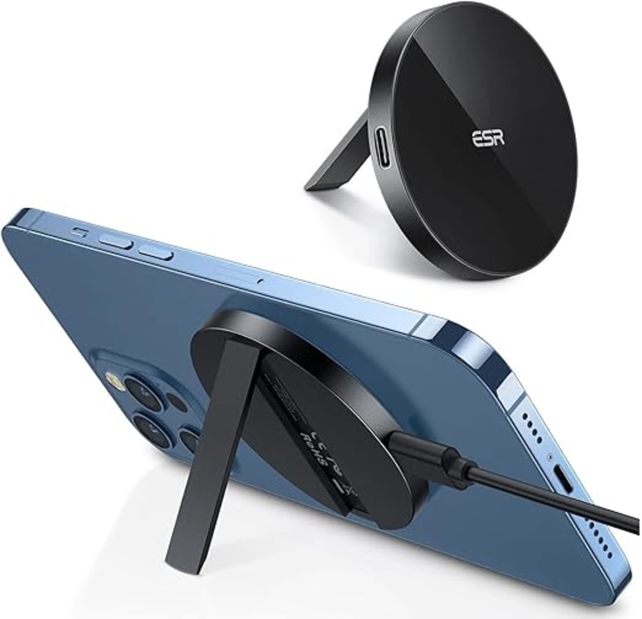 【iF2022受賞】ESR HaloLockキックスタンドワイヤレス充電器 MagSafe対応 iPhone 16/15/14/13/12 AirPods 4/3/AirPods Proシリーズ対応 マグネットケース対応 1.5 mケーブル付属 ケーブルの取り外し可能 (アダプターの付属なし) ブラック a