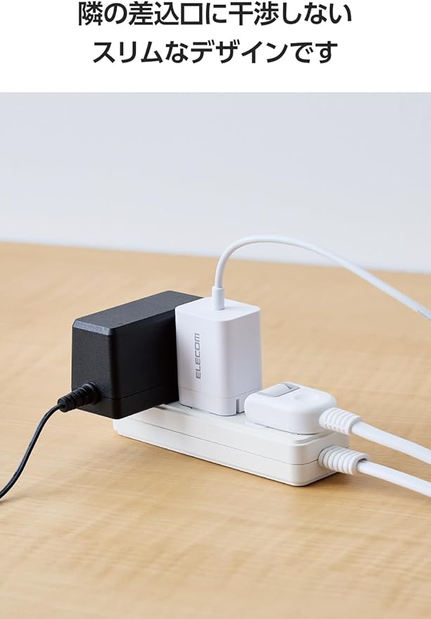 複数口があるコンセントに挿すとき、隣の差込口に干渉しないスリムなデザインです。