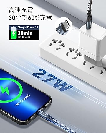 【PD高速充電対応】USB C ライトニングケーブル は3Aまでの高出力に対応しています。30分だけで、iPhone13を50%ぐらい充電できます。従来品のLightningケーブルより、充電スピードが大幅にアップされました。しかも、480Mbpsの転送スピードで写真や音楽などのファイルを30秒ぐらいに伝送できます