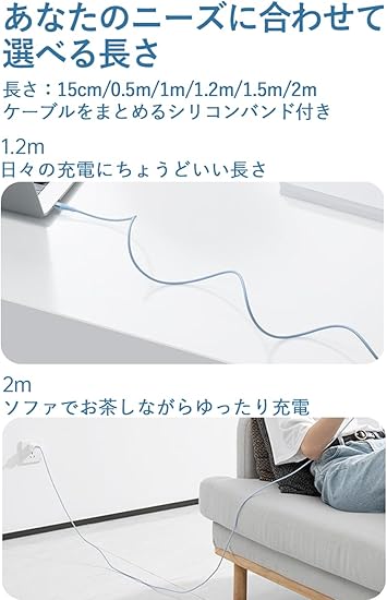 【やわらかく、絡まない】束ねてバッグやポケットに入れたり、モバイルバッテリー等の携帯用充電器に巻き付けて持ち運んだりしても絡みにくく、出し入れもスムーズです。巻いたりまとめたりしても癖がつきにくいため、いつでもスマートにご使用いただけます。