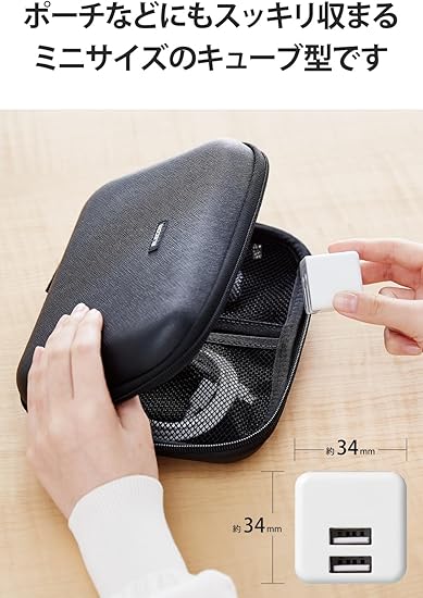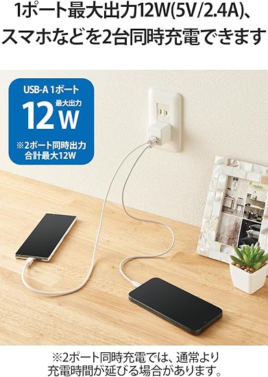 1ポート最大出力12W(5V/2.4A)、合計最大出力12W(5V/2.4A)です。