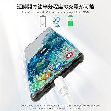 【最大100Wの超高速充電対応】このUSB CケーブルはUSB PD(Power-Delivery)対応により、最大100W(20V×5A)までの安全かつ安定した出力を実現できます。スマホはもちろん、充電に時間がかかる各種タブレット、ノートPC等の充電時間を大幅に短縮できます。▲PD充電を実現するためには、デバイスとアダプターがPD機能をサポートしている必要があります。