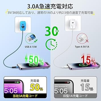 【3A急速充電&データ転送】i-Phone 充電器ケーブルは最大5V/3A急速充電、採用された高品質な銅線は電気抵抗が