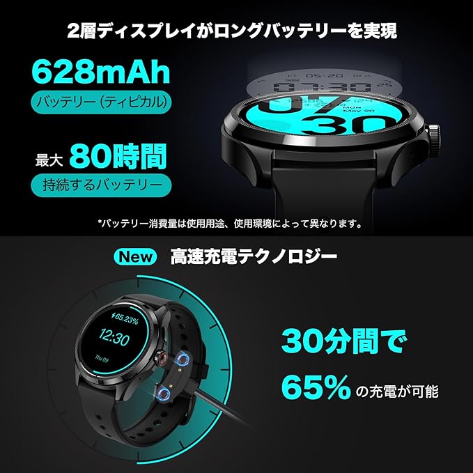 【超低消費電力ディスプレイ】:TicWatch Pro 5の2層画面は、高質なOLEDディスプレイの上に超低電力ディスプレイを採用。数日間は充電することなくウォッチ内の情報を見ることができます。さらに、この超低電力デ