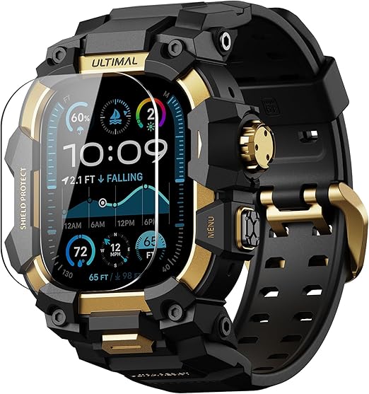 コンパチブル Apple Watch Ultra バンド アップル ウォッチ バンド 49mm ケース 一体型, ミリタリーグレード耐衝撃バンパーカバーTPU/TPE 耐衝撃 滑り止め 耐久性 落下防止 (ゴールド・ブラック, 49mm) a