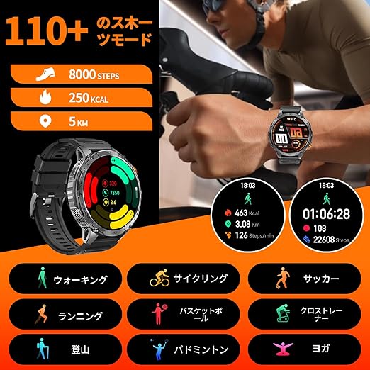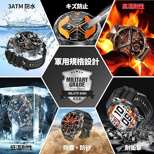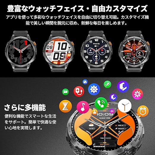 【2025年業界初1.75インチAMOLED高精度大画面&軍用規格】本スマートウォッチは高精度1.75インチAMOLEDタッチスクリーンを搭載され、より美しく、豊かになった画面内容を表現できます。466*466の高解像度で、画質がより鮮明になり、よりクリアして、直射日光下でも画面もはっきり見えます。スマートウォッチ 軍用規格の金属フレームは、高い強度と硬度が特徴で、長時間使用しても剥がれたり変色したりすることがありません。スクリーン自体に使われている素材はとても頑丈で、極地の氷河でも、熱帯雨林で