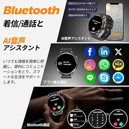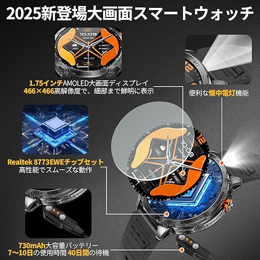 スマートウォッチ 【2025年新登場 1.75インチAMOLED大画面 高輝度懐中電灯 軍用規格】常時表示 時間設定 Bluetooth5.3通話 耐衝撃 3ATM防水 730mAh長持ちバッテリー iPhone対応 アンドロイド対応 メッセージ通知 振動と着信音設定 音声アシスタント 110+運動モード スポーツウォッチ Smart watch 腕時計 DIY文字盤 天気予報 日本語説明書 a