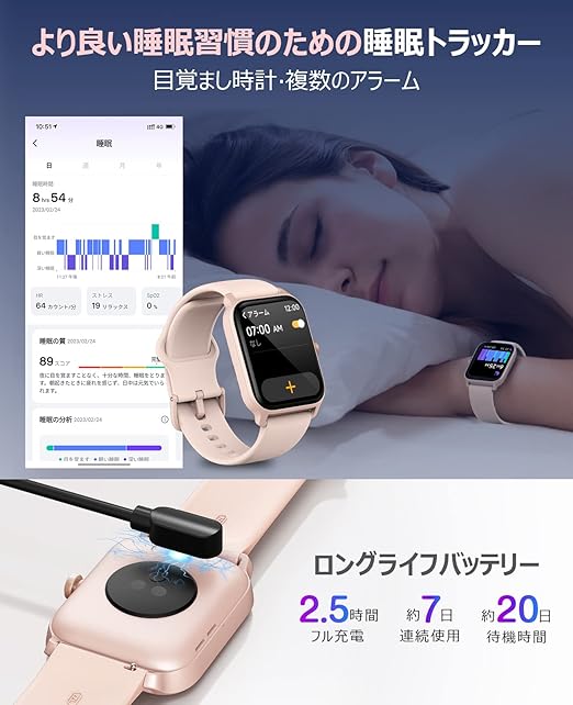 【鮮明な曲面スクリーン・極薄ボディ】高級感溢れる大画面と240*284の高解像度などの要素を組み合わせており、よりリアルな視覚体験とスムーズにタッチ触感を楽しめます。また、手首を持ち上げると画面をオンにして点灯時間と輝度調整は可能となり、日差しが強い昼間でもはっきり見えます。?薄設計で邪魔にならなくて37.7gと軽さで疲れにくく、ベルトも愛されるデザインでスタイリッシュかつ洗練、優しい触り心地で腕時計として違和感なく超快適に装着できます。