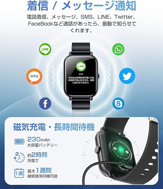 【通話機能&着信通知で家族とつながる】 Bluetooth接続により、スマートウォッチ本体での通話が可能。スマホを取り出さなくても、手元で着信応答・拒否ができ便利です。LINE・SMS・電話などの着信通知機能も搭載して