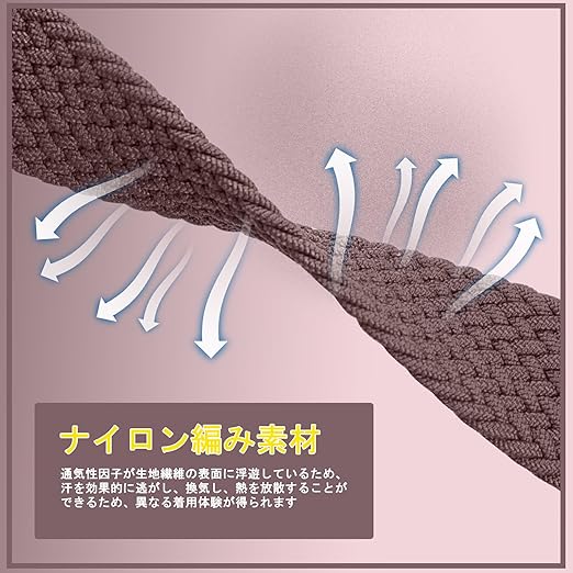 【材料】時計ベルトの素材は高品質のナイロンで編まれます。しっかり編まれて、超薄くて、手首とフィットして、着用感が素晴らしいです。柔らかくて、通気性も優れています。頑丈で長持ち可能、軽量の素材で手首に負担を与えません。速乾性も優れていて、すぐ乾かせます。調