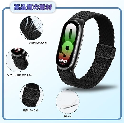 [NicMool] Xiaomi Smart Band 10 / 9 / 8バンド/Mi Band 10 / 9 / 8 用 高弾性ナイロン製 磁気バックル 調節可能 柔らか軽量 水洗いOK 耐久性 快適フィット 編組ストラップ 替えベルト シャオミ 交換バンド 10/9/8互換性保証(ブラック) a