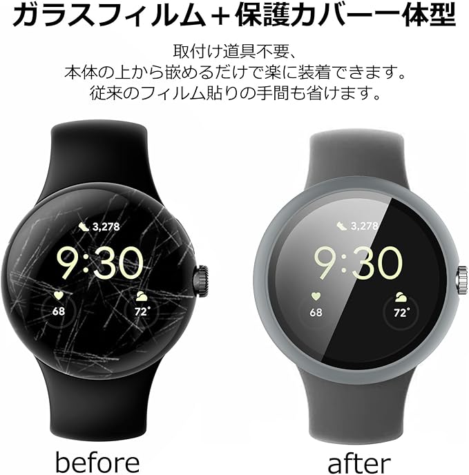 「Pixel Watch 2/Pixel Watch ガラスフィルム+保護カバー一体型」機能性とデザインを兼ね備えて、優れたPixel Watch 2/Pixel Watch ケースです。Pixel Watch 2 に合わせて丁寧に作られたフレームなので、違和感なく本体にジャストフィット!日常で起きる損傷リスクを高強度なフィルム層が防ぎ、液晶をキズから保護します。
