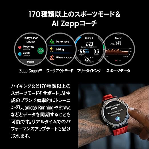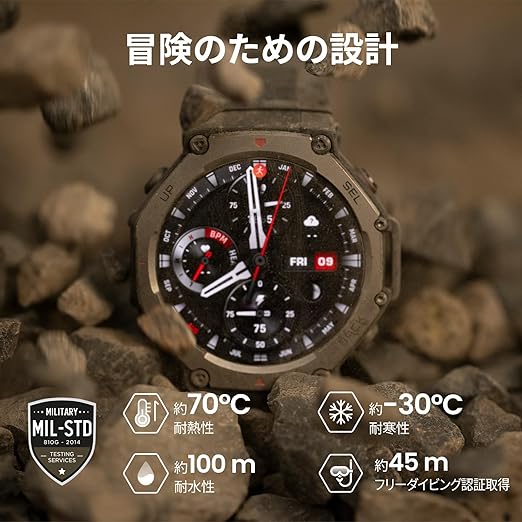 【ステンレススチールボディと卓越したディスプレイ性能】高強度なステンレススチールのベゼルと1.5インチの大画面で2,000nitを誇るディスプレイの融合は過酷な環境下でもあなたを支えます。また、暗い場所で目の疲れを軽減するナイトモードが搭載されてます。【軍用レベルの強靭さ】過酷な温度や環境に耐えるため、9項目の軍事規格の強靭性試験(MIL-STD-810G)をクリアしています。低温モードは、-30度の温度でも腕時計を使用可能で、あなたの限界への挑戦をサポートします。また、10ATMの防水性能を備