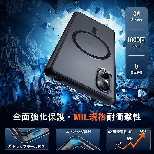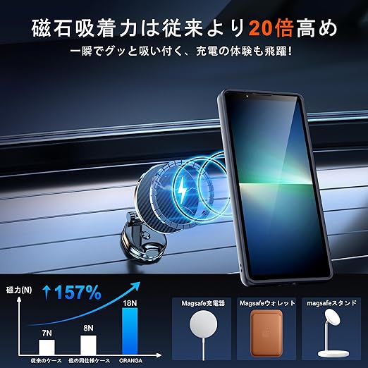 【MagSafe対応&永久磁石を搭載】最新Xperia5vケースの背面に38個の強力なN52マグネットを搭載しており、吸着力を高めて、安定感をアップしてエネ損失なしの快速ワイヤレス充電できる。さらに、いくら振っても落ちないので、充電しながらゲームをやっても問題なし!MagSafe車載ホルダーでの使用時もとても安心感溢れ、市販のあらゆるMagSafe用のアクセサリーと相性バッチリ対応しています。対応機種:Sony Xperia 5 V