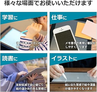紙に書くような描き心地を実現する、ペーパーテクスチャ 保護フィルムです。表面はアンチグレア(反射防止)タイプなので、光の反射や映り込みを抑えます。※本製品はフィルムの表面を特殊加工し、スタイラス等で筆記する際に抵抗を持たせるようにしております。そのため、タブレットのガラス面に直接描く