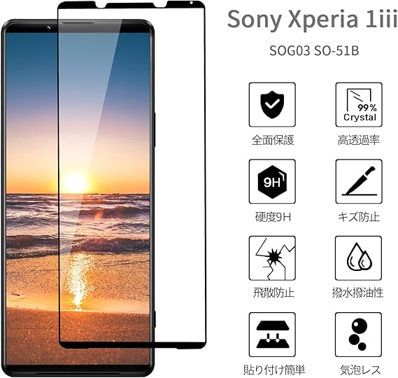 【2枚セット】 Xperia 1 III 用 ガラスフィルム 高透過率 全面保護 SOG03 SO-51Bフィルム エクスペリア1マーク3強化ガラス 液晶保護フィルム 【干渉しない/指紋防止/貼り付け簡単/気泡ゼロ】 a