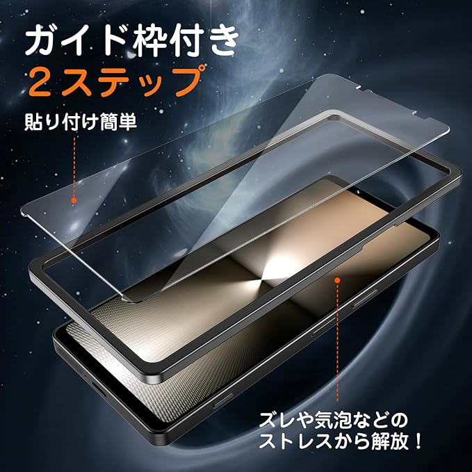 【貼り付け簡単&ガイド枠付き】 2ステップだけで、初心者として完璧に貼り付け!画面に置くだけでキレイに貼れ、気泡も抜けやすい。CNC彫刻加工を採用されたガイド枠はXperia