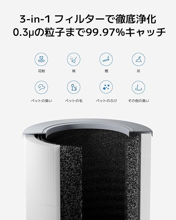 【コンパクトでもパワフル】22×35cm、約2.2Kgのコンパクトデザイン。 空気清浄機のpCADR は230 m3/h、0.3μmの粒子を99.97%のろ過できます。粒子状物質センサー、空気質の高感度モニタリング、浄化強弱の自動調整により、常に新鮮な空気を提供します。リビングルーム、寝室、仕事場、どこでもきれいな空気を。