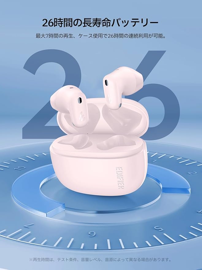 【26時間の長時間再生・急速充電対応】徹底した省エネルギー設計によりイヤホン単体で最大7時間、充電ケースの併用で最大26時間もの連続再生を実現しました。急速充電対応なので、急な外出や通学通勤でも15