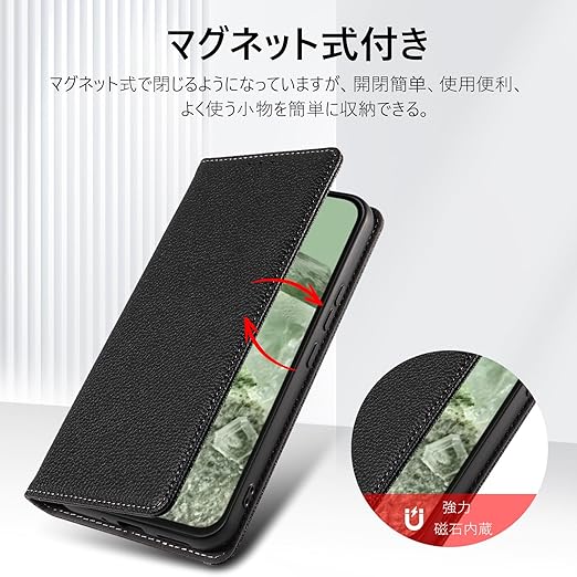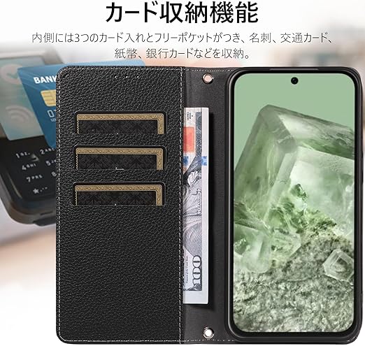 【カード収納機能&隠しマグネット設計】ピクセル8a ケース 手帳型の内側には3つのカード入れとフリーポケットがつき、名刺、交通