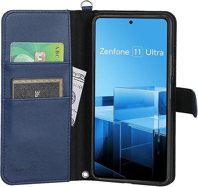wisers Zenfone 11 Ultra ケース 手帳型 スマホケース 対応 (ダークブルー) (カードホルダー/スタンド機能付き) ストラップ 2種付き (ハンドストラップ/ネックストラップ) 2024年 新型 a