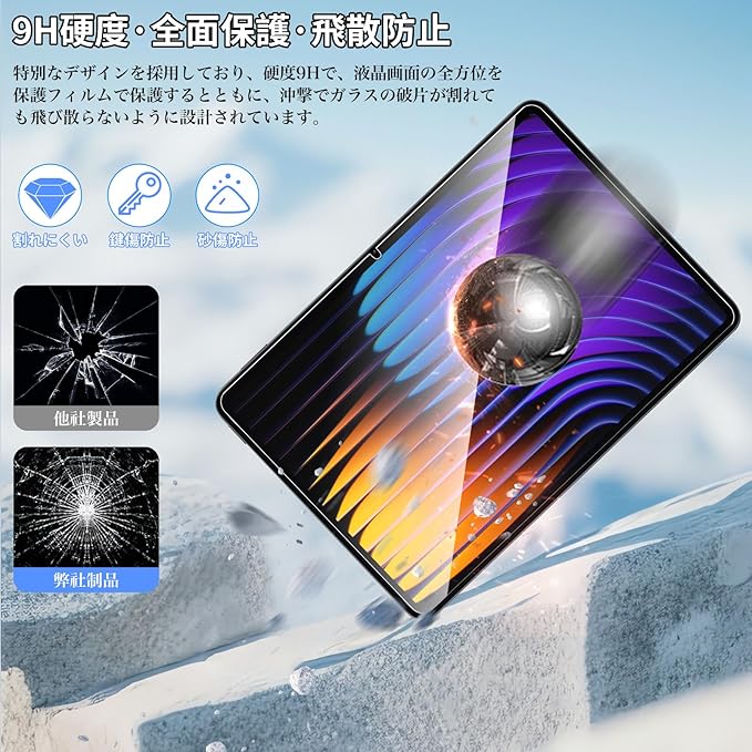【高硬度9H ・飛散防止】日本旭硝子材料を使用し、沖撃に強く、落下、摩擦、沖撃でも簡単には割れません。沖撃を最小限に抑え、画面の破損を抑え、画面をスクラッチから保護します。