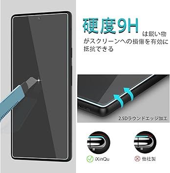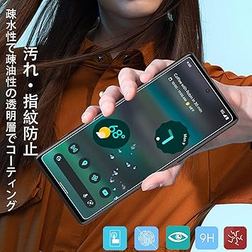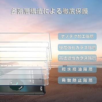 【硬度9H越え・耐衝撃性】旭硝子の素材を採用した、硬度9Hの、ハードコート技術を活用し、保護フィルムが外部からの衝撃力を吸収し、画面の損傷を最小限に抑える。特殊な飛散防止設計により、ガラス膜が割れてもガラス片が飛散せず、高