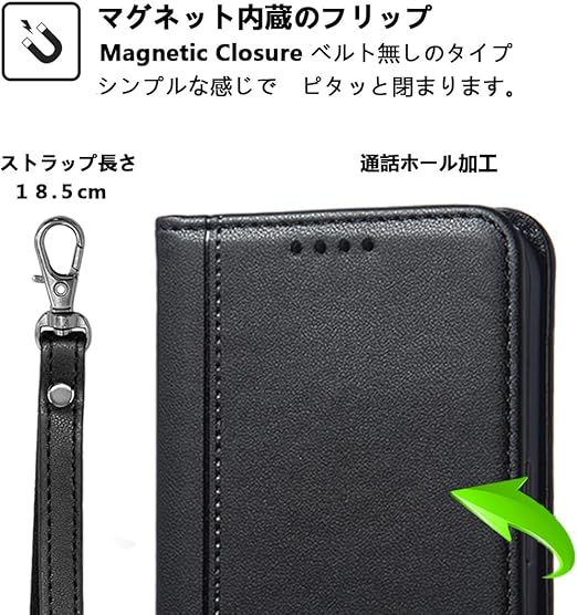 【機能性2:ストラップ付き】ストラップホール付きです。スマホカバーと同じの色合いを持つスプリングシャックル式のハンドストラップも同梱販売です。取替が易くて使い勝手が良いのです。ストラップの長さ:18.5cm。やは