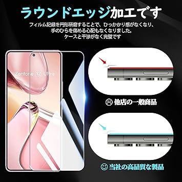 【対応機種】 ASUS Zenfone 12 Ultra 用 高透過率 ガラスフィルム。【注意】この電話の画面の端は湾曲しているため、保護フィルムのサイズが丁度良い場合、しっかりと貼り付けられず、白いエッジやシェルとの干渉などの問題があるため、保護フィルムは画面よりも小さいです。