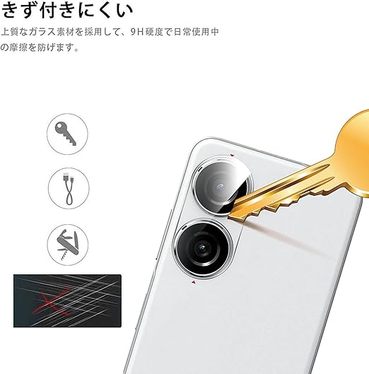 【日本製素材旭硝子製】日本製素材旭硝子製、業界硬度レベル9H以上、ハードコーティング技術により、日々の生活の中で発生するスリ傷から Zenfone 10 のレンズを保護します。