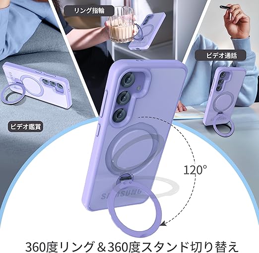 【定点360度回転スタンドとMagSafe兼用】新登場のギャラクシーs24 Plus ケースはユニークなマグネット環とリングスタンドの複合構造のデザインを採用しており、360°回転ベアリングで自由に動かせ、MagSafe充電中でも縦横スタンドが使用可能です。便利な隠れスタンドはケースと一体型になり、360°回転できる機能により、無段階調節で0°から120°までサポートで、横起きあるいは縦起きはもちろん、絶妙なデザインで携帯を自由に多角度を調節でき、 力よくスマホを支えて、映像や読書などに楽しめる
