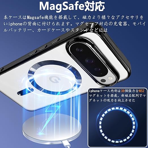 【Magsafe 対応】 本ケースはMagsafe機能を搭載して、磁力より様々なアクセサリをGoogleの背面に付けられます。マグセーフ対応の充電器、モバイルバッテリー、カードケースやスタンドなどには、専用の磁石配列より、Googleを連結してご利用できます。Googleケース内部は38個強力なN52マグネットを搭載、新磁石配列でマグネットの吸力を向上させた。HaloLock・MagSafeアクセサリーと一緒に使うと、適切な位置にきちんと引っ付き、より簡単により速く充電できます。