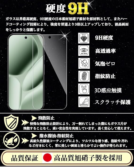 【指紋認証対応!対応機種】Google Pixel 10 Pro XL ガラスフィルム (2枚)+ Pixel 10 Pro XL カメラフィルム (2枚)。【注意】Pixel 10 Pro XL フィルムを正しく貼り付けた後に以前に登録された指紋を削除して新しい指紋をもう一度登録してください。指紋認証が機能しない場合は、タッチ感度を上げる設定を行うことをお勧めします。(取り付け後の指紋の位置に気泡がないように注意してください。)